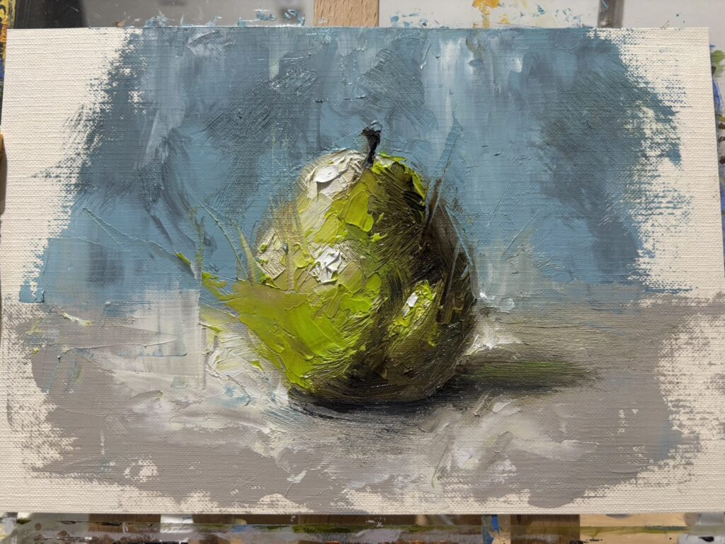 | 2/18 | 油絵中級講座ー⑤梨をナイフのスクラッチで描く | スクラッチが綺麗に出来ている 背景の青がアクセントになっている |