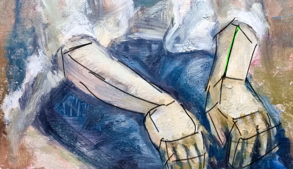 次は手と腕をクローズアップして見ていきます。 上の絵を見るとリアルに描くというよりは、大きな形捉え、少し抽象的に描いています。左下の足のラインやシャツのラインは結構ぼけています。