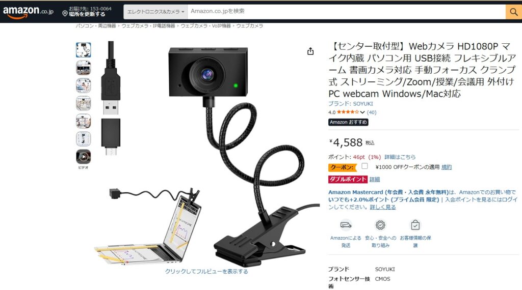 ●【センター取付型】Webカメラ HD1080P マイク内蔵 パソコン用 USB接続 フレキシブルアーム 書画カメラ対応 手動フォーカス クランプ式 ストリーミング/Zoom/ 外付けPC webcam Windows/Mac対応