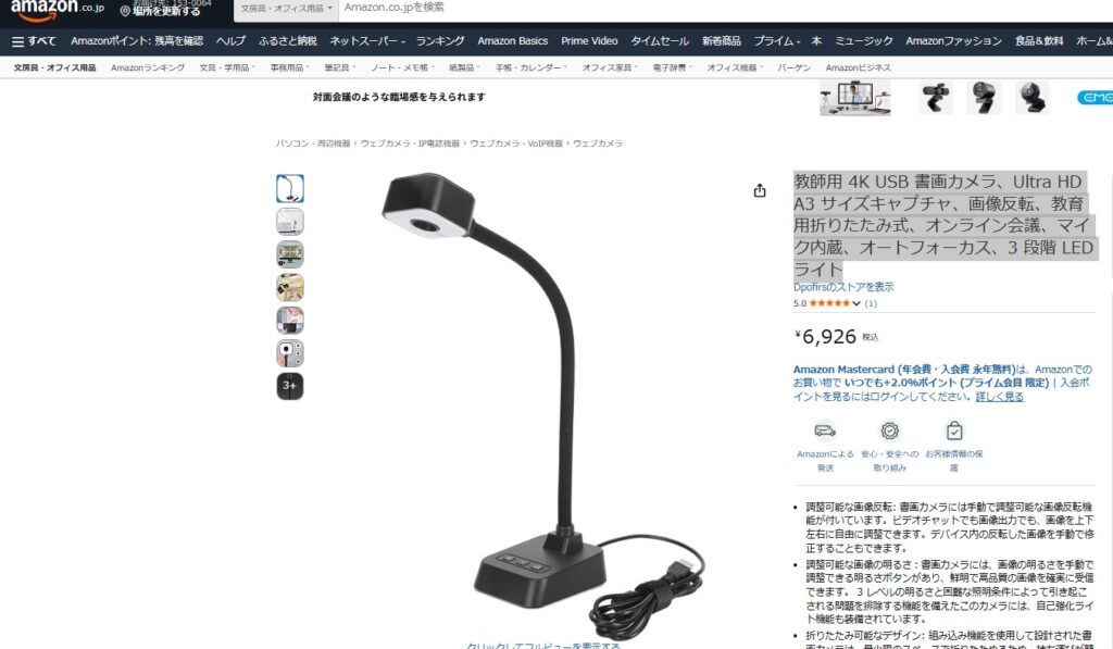 ●教師用 4K USB 書画カメラ、Ultra HD A3 サイズキャプチャ、画像反転、教育用折りたたみ式、オンライン会議、マイク内蔵、オートフォーカス、3 段階 LED ライト